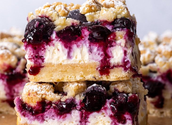 • Allow the bars to cool completely to room temperature in the baking pan and then chill them in the fridge for at least 2 hours. Once chilled, use the overhanging parchment/baking paper to remove them out of the pan, slice and serve. You can dust them with some powdered/icing sugar, if you wish.The blueberry cheesecake bars will be even better after an overnight chill in the fridge.