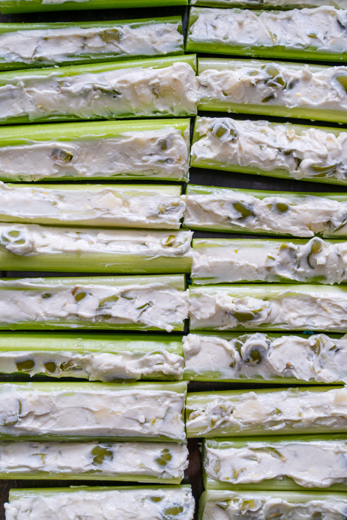 This is an easy no-cook appetizer that comes together quickly. Once the filling is mixed, all you need to do is cut the celery into manageable sticks and spread the mixture into the center. A short chill in the fridge helps the filling firm up and lets the flavors come together even more.