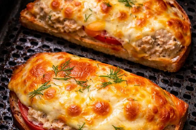 This open-faced air fryer tuna melt features crispy toasted bread, creamy tuna salad, juicy tomato, and perfectly melted cheese. Ready in under 10 minutes, it’s a quick high-protein lunch with golden edges and foolproof texture.