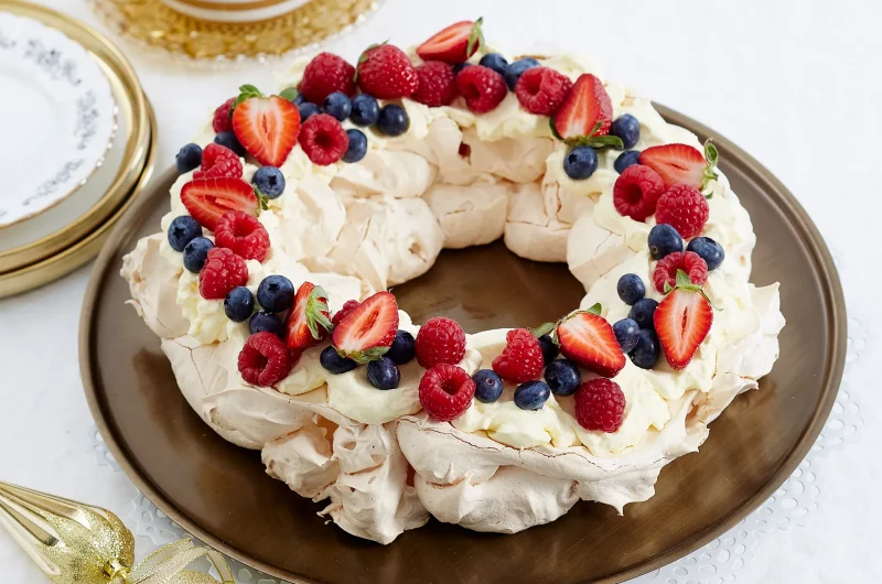 - Once cool, whisk the double cream to stiff peaks and then add the icing sugar and whisk again. Dollop onto the top of the wreath and decorate with the fruit. Store in the fridge for up to 3 days.