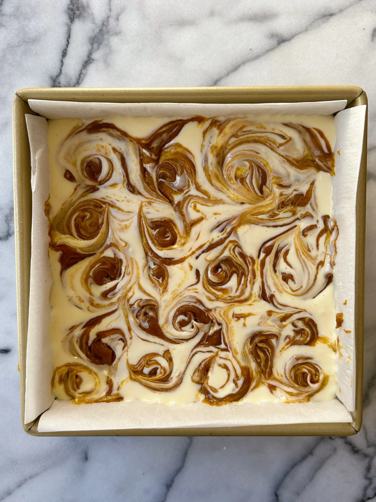 With the cheesecake layer poured into the pan, we’re ready to add our pumpkin swirl!