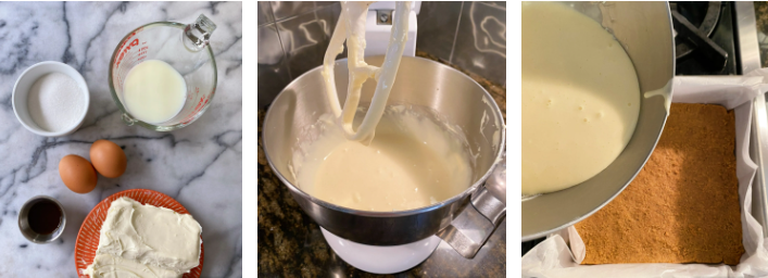 While the graham cracker layer bakes for just 8 minutes, we whip up the cheesecake filling which is a luscious and creamy blend of:
