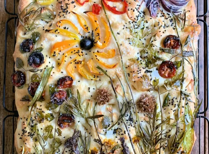 If you want to cold ferment the sourdough focaccia bread in the fridge overnight, the best time to do this is once you’ve shaped the dough in your chosen baking pan. Allow it to rise a little and then place into the fridge. Take the dough out a few hours before you want to bake it to allow it to come to room temperature. You want the dough to be puffy and full of bubbles before it goes in the oven.