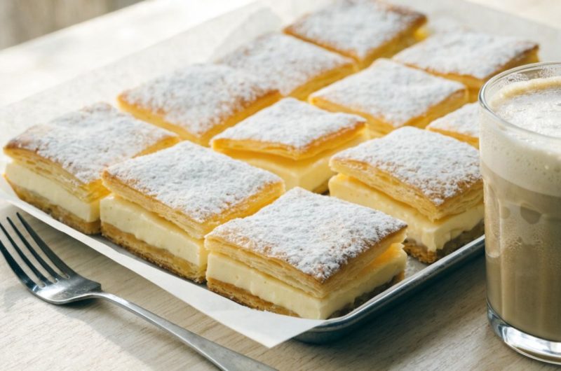 Serve the cream slices on an elegant tray. Fresh fruit, espresso, or tea go well with it. For brunch or afternoon coffee, add fresh mint leaves or a little fruit puree. Perfect for birthdays, family celebrations, or special occasions.